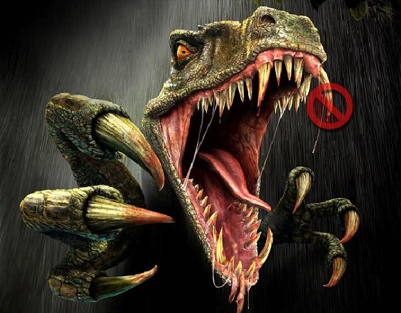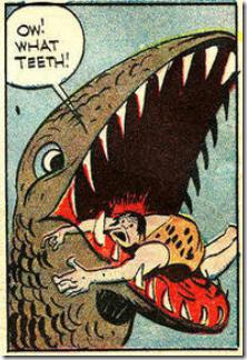 圖一中的這只尖牙利爪目露兇光,稱A。圖二中這只同樣血盆大口但目光可愛仿佛因吃驚才長(zhǎng)大了嘴巴的,稱B。雖然A風(fēng)格細(xì)膩,生動(dòng)傳神,貌似很逼真,但是那兩對(duì)長(zhǎng)長(zhǎng)的“獠牙”卻是犯了想當(dāng)然的錯(cuò)誤。哺乳動(dòng)物里的獵手門都有尖長(zhǎng)致命的犬齒,其中最深入人心的當(dāng)屬劍齒虎,他上頜的那兩把利刃可謂犬齒的極致,但是在遙遠(yuǎn)的侏羅紀(jì),恐龍并沒有如此專事獵殺的牙齒。將今論古是需要保持謹(jǐn)慎的。事實(shí)上食肉類恐龍的牙齒正如漫畫B中所示:匕首狀,前后大小基本一致,而又參差不齊。
