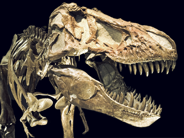 從這張霸王龍的頭部特寫中,我們可以看出:他的所有牙齒形狀相同,長(zhǎng)短不一,排列并不緊密。這正是吃肉的獸腳類恐龍的典型特征。與哺乳動(dòng)物相比,恐龍的牙齒為終生生長(zhǎng)的同型齒。我們都很熟悉的門牙虎牙和磨牙,在恐龍還沒有分化,滿口的牙都長(zhǎng)得一個(gè)樣子,叫同型齒。而后來的哺乳動(dòng)物有門齒犬齒和臼齒,稱異型齒。我們的牙齒有兩套,幼時(shí)是無根的乳齒,后來被恒齒替代,而恒齒脫落后是不能再長(zhǎng)出的。而在恐龍牙齒是終生生長(zhǎng)的,不是像老鼠的門牙那樣不停的長(zhǎng),而是一直進(jìn)行新舊更替,這就是為什么這張照片上的牙齒明顯大小不一,剛露頭的牙齒是正在長(zhǎng)出。