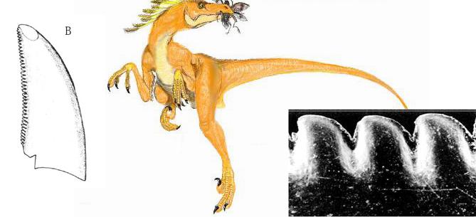 由于時(shí)代久遠(yuǎn),這些迷人的生物給我們留下的可供研究的痕跡并不多,保存完整的骨架就更是少之又少。而牙齒因?yàn)橄鄬?duì)較小,質(zhì)地堅(jiān)硬,表面還有釉質(zhì)保護(hù),易于保存。所以牙齒化石就成為最常見的恐龍遺跡。隨著恐龍學(xué)家們對(duì)牙齒研究的深入,已能通過牙齒鑒別出恐龍的大致種類。1990年,加拿大艾伯塔省的Philip Currie 就利用牙齒鋸齒的形態(tài)特征的變化將當(dāng)?shù)厣钤谕戆讏资?nbsp;(Late Cretaceous)的獸腳類的恐龍分為四大類:馳龍(Dromaeosaurinae):大名鼎鼎的恐爪龍就屬于這一類;伶盜龍(Velociraptorinae);傷齒龍(Toodontidae);暴龍(Tyrannosauridae).