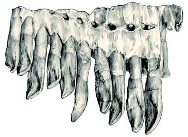 這些形狀各異的牙齒是怎樣工作的,要解決這個(gè)復(fù)雜問題,遠(yuǎn)比推斷肉食恐龍難得多。因?yàn)樗麄兏F(xiàn)今的素食動(dòng)物的牙齒實(shí)在相差太遠(yuǎn)。這些有著明顯磨痕的牙齒可以進(jìn)行原始的咀嚼嗎?各種答案中唯一可以肯定的是:如果他們能在一定程度上嚼碎樹葉,整個(gè)過程也是僅限于垂直方向。因?yàn)殛P(guān)節(jié)的構(gòu)造說明了下頜無法在水平方向上運(yùn)動(dòng)。而且牙齒上的磨蝕面也證明了這一點(diǎn)。如果你認(rèn)真觀察牛羊吃草或者反芻,會(huì)發(fā)現(xiàn)他的下頜左右晃動(dòng)的很厲害。正是這種運(yùn)動(dòng),配合臼齒寬大多嵴的咀嚼面,把草料充分磨碎。雖然近來的研究發(fā)現(xiàn)有些進(jìn)步的鳥腳類(禽龍和鴨嘴龍類)已經(jīng)演化出比較進(jìn)步的取食機(jī)制,也可以上下頜橫向移動(dòng),雖然沒有幅度那么大。咬合時(shí),上頜斜向外,下頜斜向內(nèi),產(chǎn)生原始的“咀嚼”,但大多數(shù)恐龍只能用大量的牙齒上下相對(duì)的擠壓切割,把枝葉咬碎。